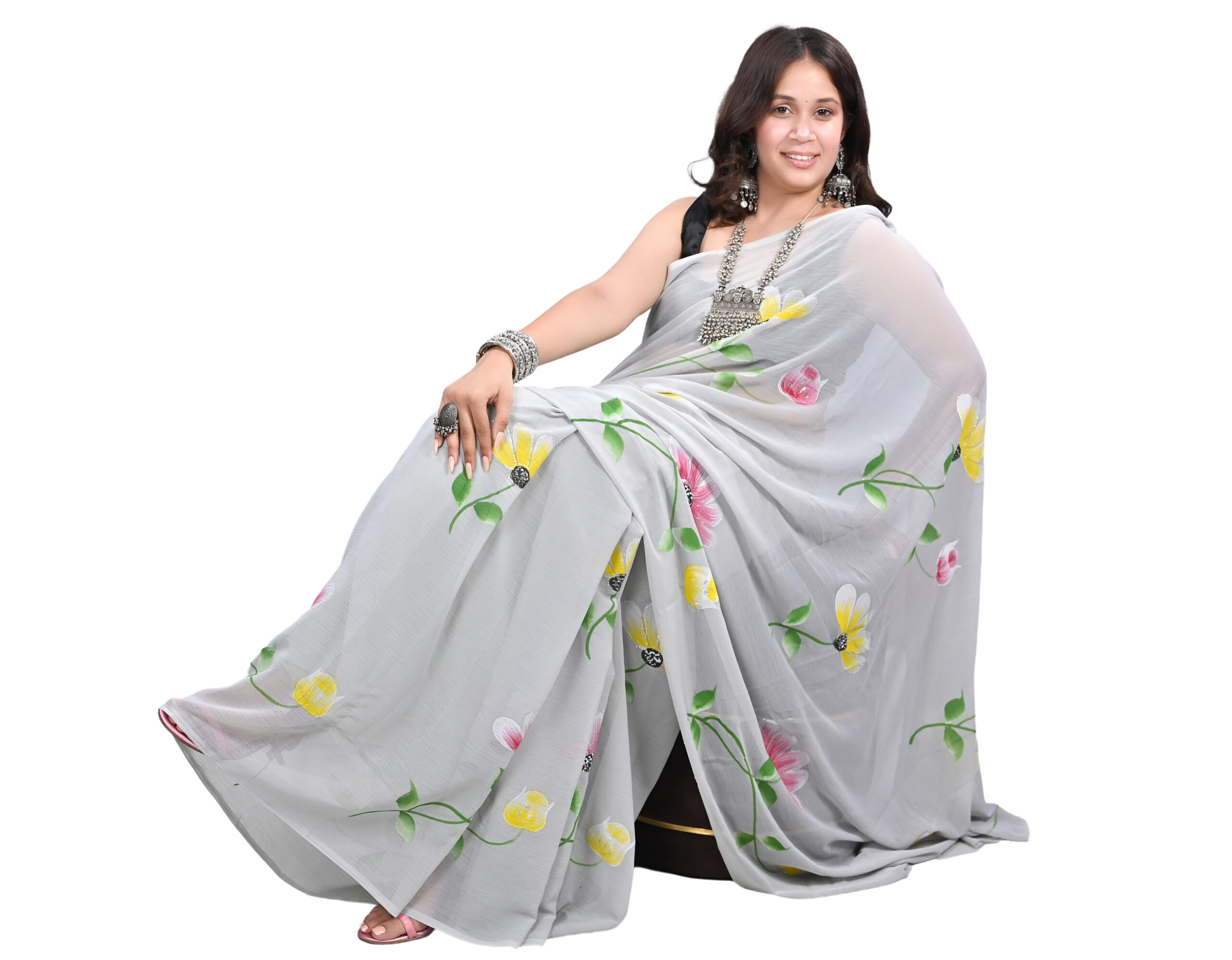The soft grey tone adds sophistication, while the colorful hand-painted flowers bring life and vibrance to the look. Made from pure cotton, this saree is lightweight, breathable, and easy to drape, perfect for Indian weather.